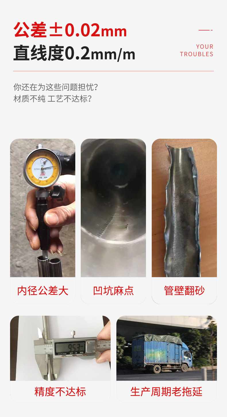 2、产品特点:高精度管;外径极限偏差±0.02mm,内径极限偏差±0.025mm,内孔围度公差0.020mm外径为1.3mm-3.0mm,壁厚为 0.015mm-0.08mm,全长为1.5mm-6.0mm的金属精密钢管满足有很高的尺寸精度和洁净度的要求.一般都是无缝管,不锈钢精密无缝钢管。